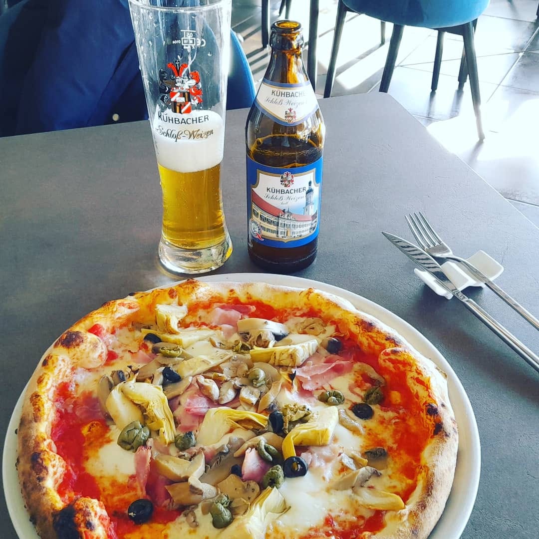 The pizza arrives, looking rich. It is good. The filling consists of tasty products. A special mention goes to the capers, nice and big and tasty. The beer, a Kühbacher Schloss Weizen, bottled, is properly opened at the table. I appreciate beer, drinking almost all varieties. My favorites are definitely the white ones.