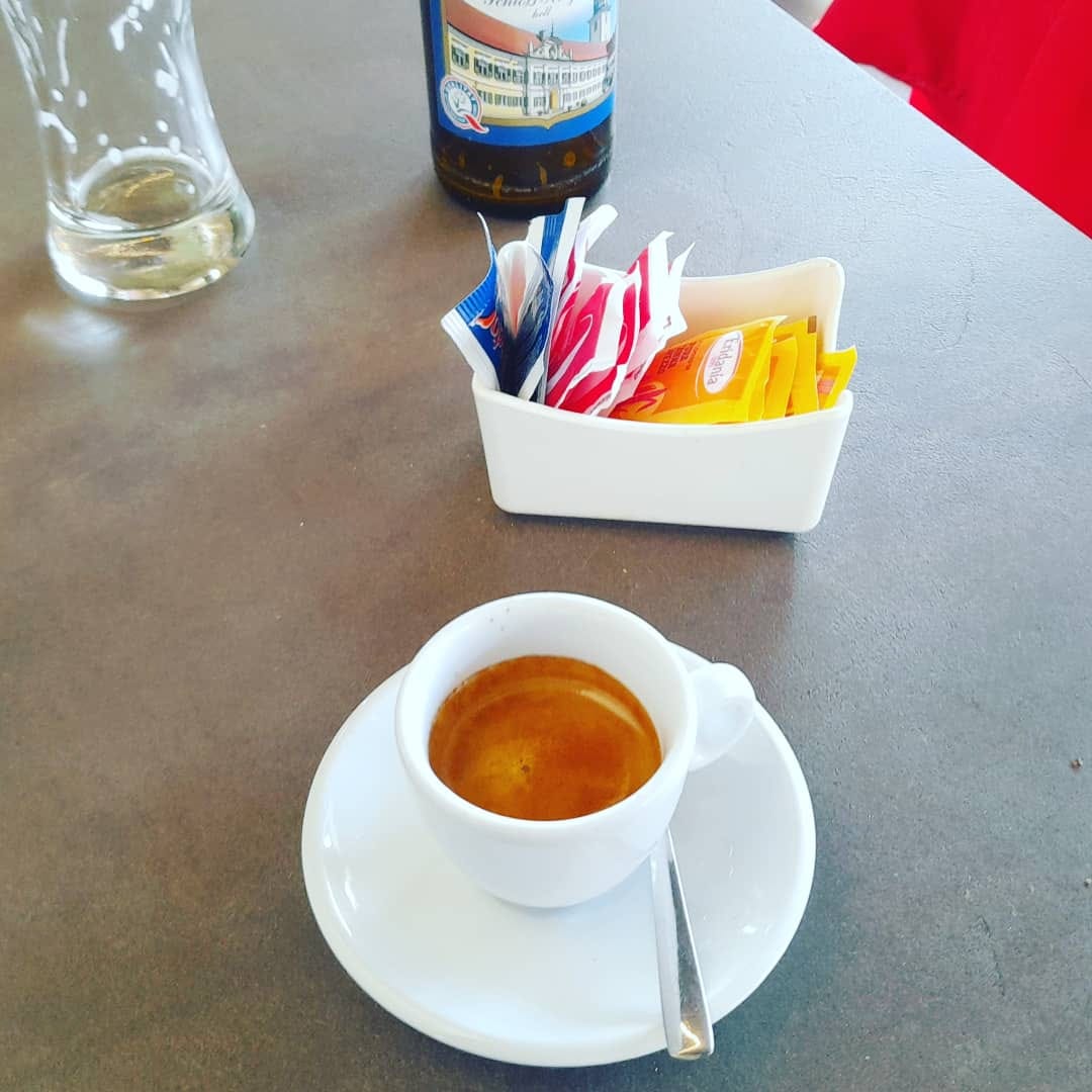 I close with a coffee, pay the bill (25.50 euros) and say goodbye. I go down the stairs, I find myself outdoors. It's cold, it's windy, the umbrellas are closed and the tables are empty. There is sun, there is the lake, it's a beautiful day.